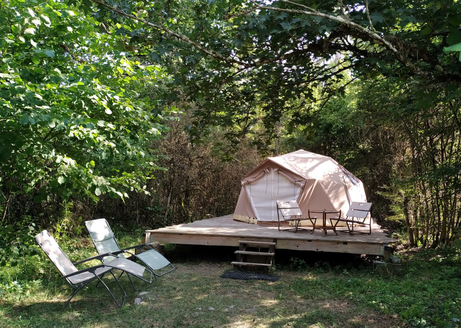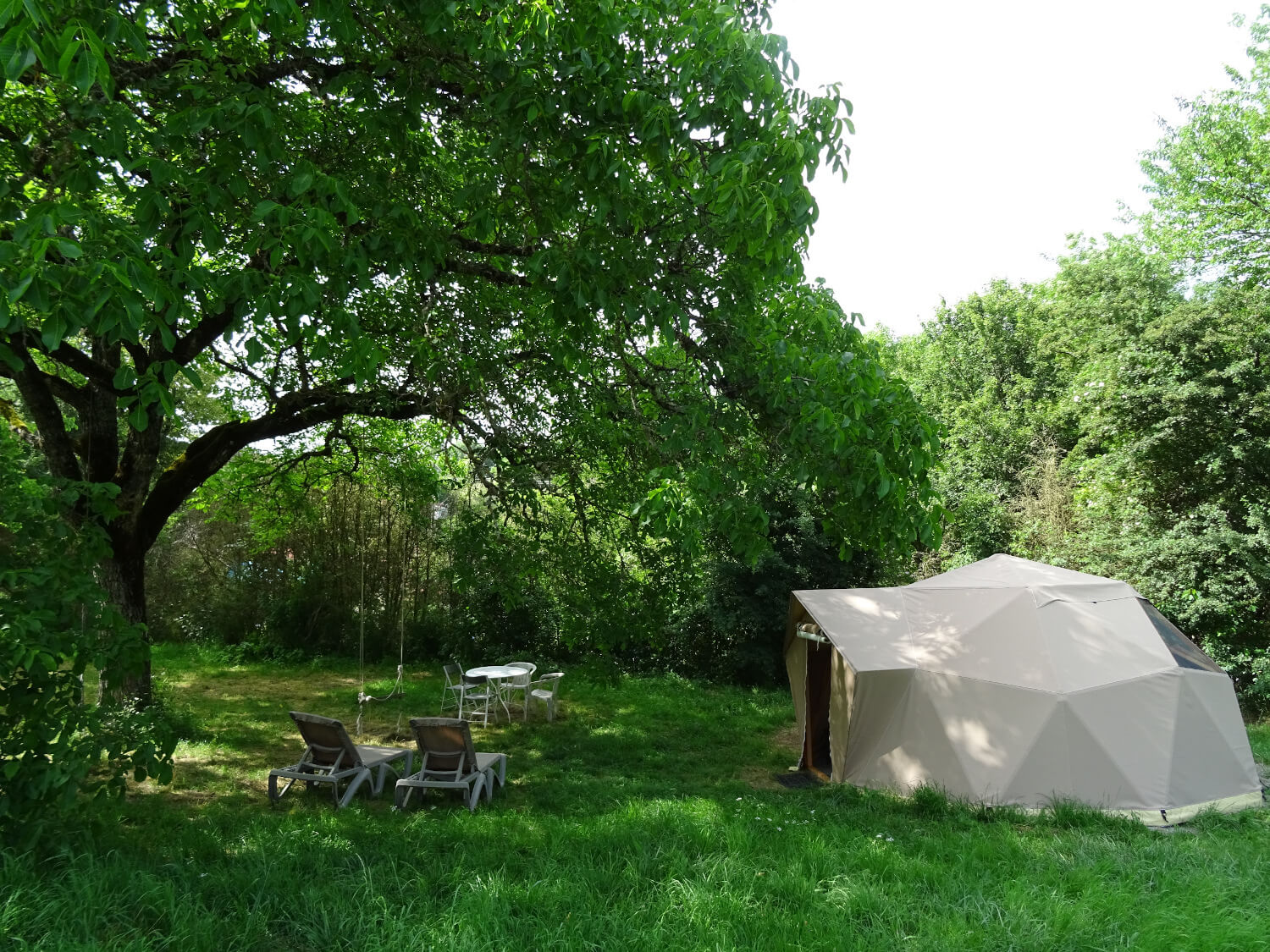 A l’extérieur : 2 transats, une table et des chaises, une balançoire est installée à côté de la tente, dans un grand noyer.