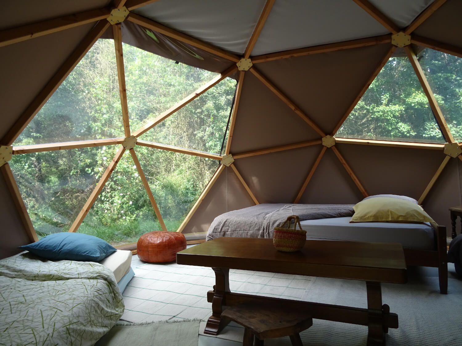 A l’intérieur : un lit 2 places + 2 lits 1 place, avec couettes et oreillers (les draps sont mis à disposition), des couvertures d’appoint pour les nuits fraîches, du petit ameublement (grande table basse, petit tabouret et pouffe, tables de nuit, coffre de rangement).