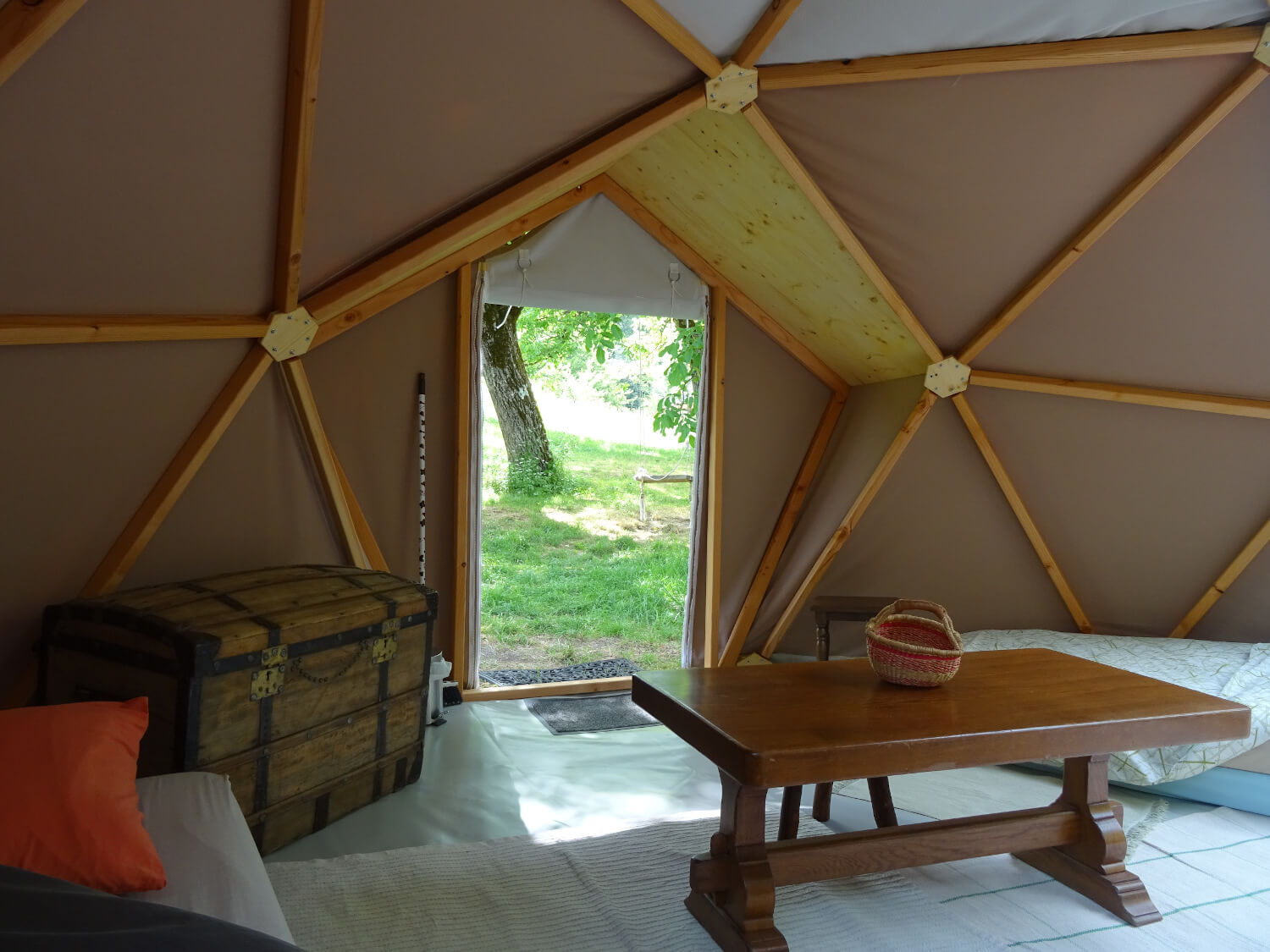 Grand dôme géodésique en bois de 19 m² de fabrication locale (Vercors), installé dans une prairie, à côté de 2 grands noyers. La toile comprend des parties transparentes ainsi qu’un toit ouvrant et des moustiquaires, ce qui permet de se sentir à la fois dans un cocon et immergé dans la nature.
