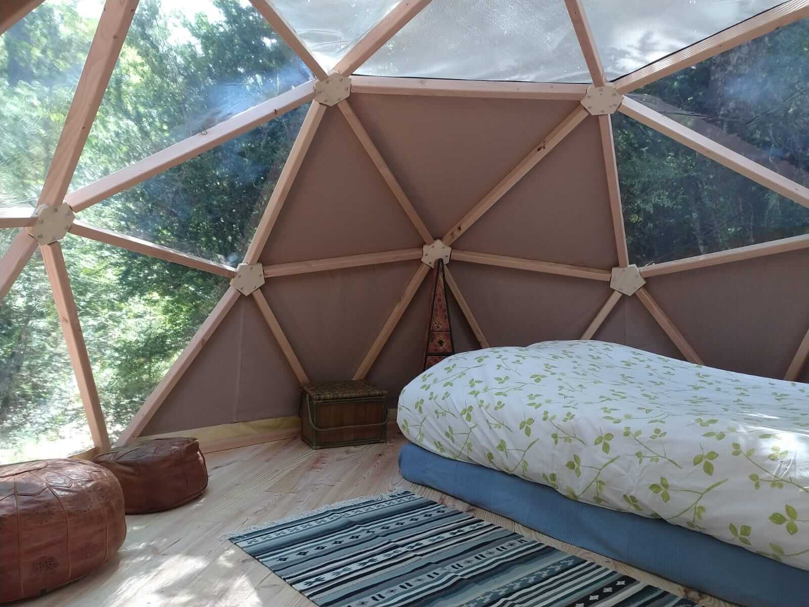 A l’intérieur : un lit double avec couette et oreillers (les draps sont mis à disposition), une couverture d’appoint pour les nuits fraîches, du petit ameublement.