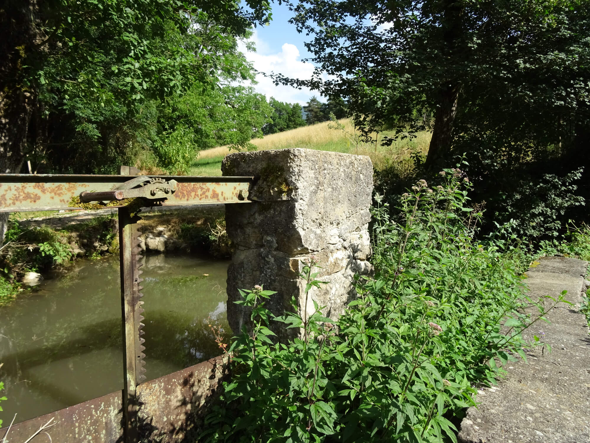 Un élément central de cet ancien moulin, c’est l’eau ! En plus des rivières nommées plus haut, un petit canal achemine une eau de source, qui alimente le bassin central de la cour.