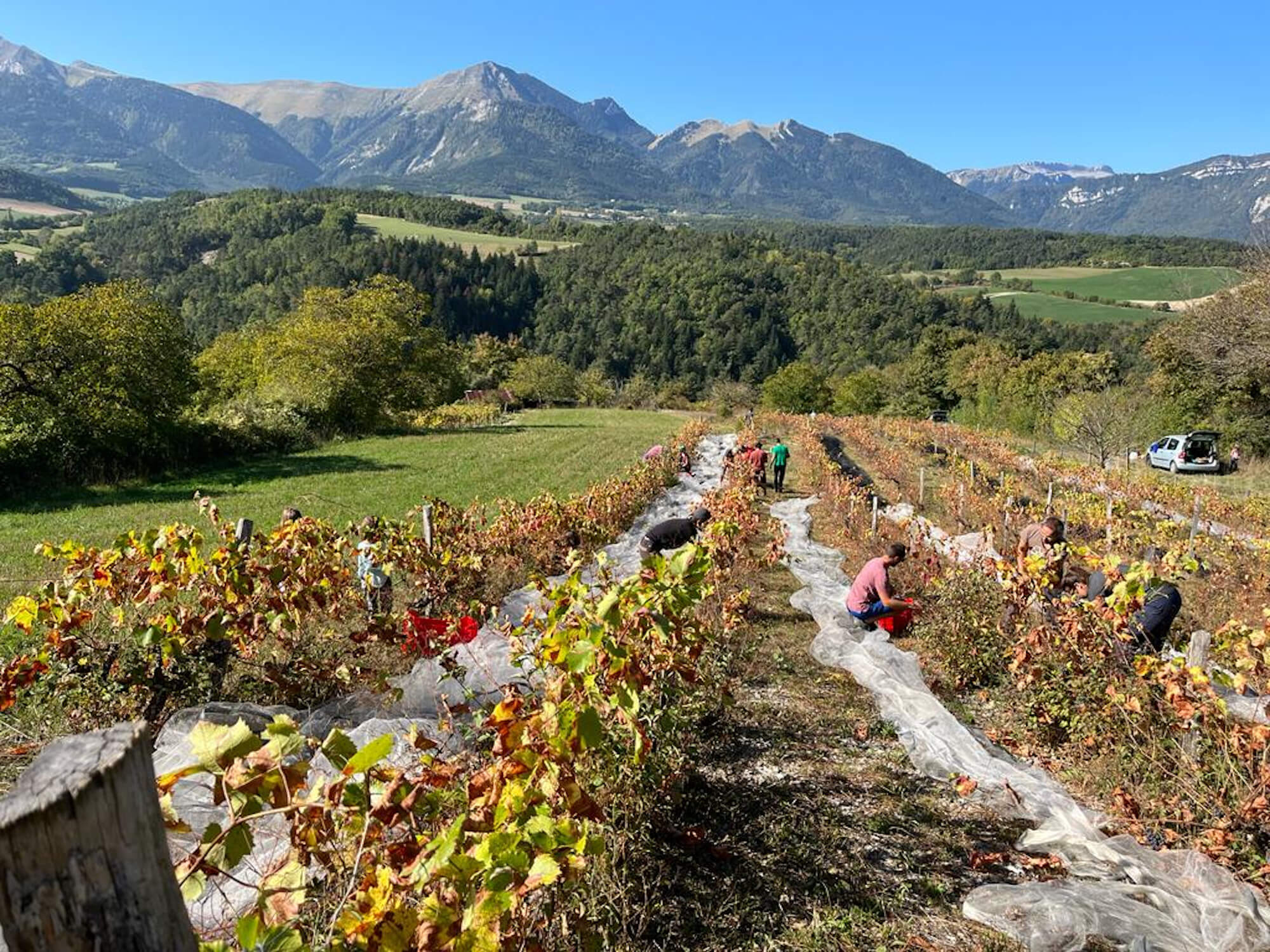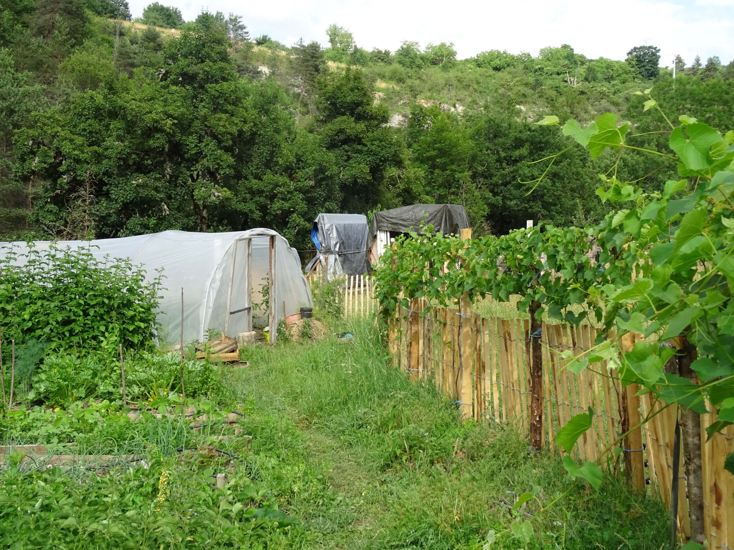 Nous cultivons également quelques parcelles de vignes, sur le coteaux bien ensoleillé situé au-dessus du Moulin. Il s’agit majoritairement de vieilles parcelles avec des cépages locaux anciens. Et depuis le printemps 2025, nous avons planté de jeunes vignes, de variétés hybrides diverses. A la fois producteurs, consommateurs et expérimentateurs, notre objectif est de vinifier du bon vin sans avoir à traiter la vigne. Nous avons dans la vigne les mêmes pratiques qu’au jardin : respect de la vie du sol et aucun intrant chimique de synthèse.